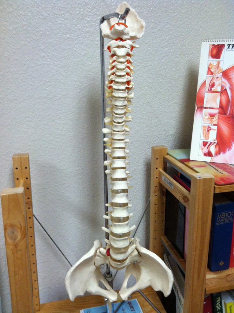 The spine consists of 24 vertebrae (7 cervical, 12 thoracic, and 5 lumbar) plus the sacrum and the coccyx, all connected to each other, like a chain, via synovial joints that allow the spine to bend forward, backward, sideways, as well as rotate to some degree.